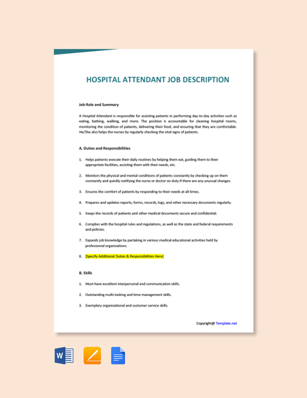 Attendants duties include maintaining the cleanliness and orderliness of operational areas, monitoring product inventories and requesting necessary stocks and equipment, performing administrative tasks as needed, escalating concerns to the management for immediate resolution, and conducting maintenance services. While performing the duties of this Job, the cast member is occasionally exposed to fumes or airborne particles and toxic or caustic chemicals. Required to bend, stoop, lift and reach high and low areas. Able to communicate with guests and co-workers. 2. Room Attendant Job Description. Job Description Example.